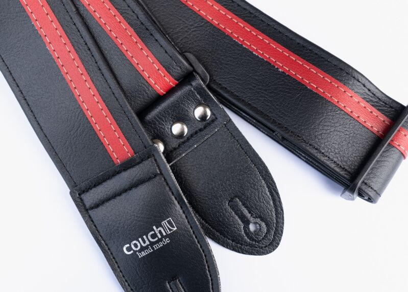Although we've made MANY different color combinations of our Racer X Straps over the years, the black with red has become a mainstay forever as one of our best selling vegan leather guitar straps. We first made one of these as a custom one-off and we liked it so much we started doing them in in a few boutique sized small runs and a few lucky people have been picking them up to the point where they are now in full sized runs of this custom vegan leather guitar strap.