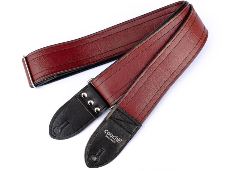 Influenced by the vintage Samsonite luggage bags from mid century to the early seventies, the Dark Red Luggage Strap is an excercise in simple, well made, attention to detail industrial design. A set of double "luggage" stitches runs along the length of the deep dark red grained vegan leather. Notice the black edge piping effect we create by folding over the black edges along the straight cut oxblood red guitar strap vinyl. Each vegan red leather guitar strap includes custom forged steel hardware and hand-affixed steel rivets. Part of our Luggage Strap Series from Couch. A new classic in cool guitar straps - or electric bass straps! Beautiful. Simple. Sturdy. Strong. Couch. Rock. Made in USA so that you may rock.