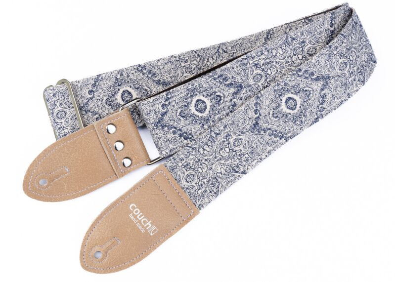 Blue Paisley Guitar Strap made of printed canvas cloth and backed by brown vegan leather. Finished with white stitching. Also features vegan buckskin end tabs and custom forged steel hardware. This is a limited edition strap hand made in the USA by Couch.