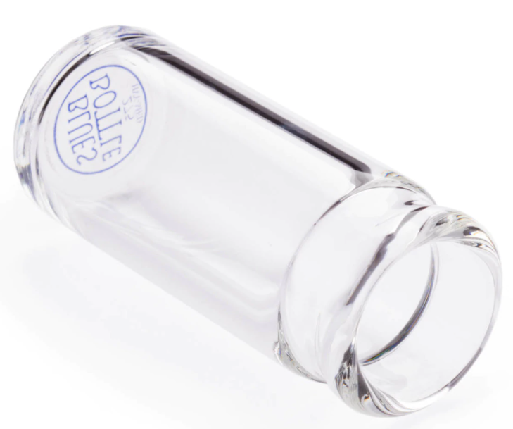 This glass medicine bottle slide provides a crisp, bright tone, featuring a closed, weighted end for balance, heavy wall thickness, and a medium diameter.