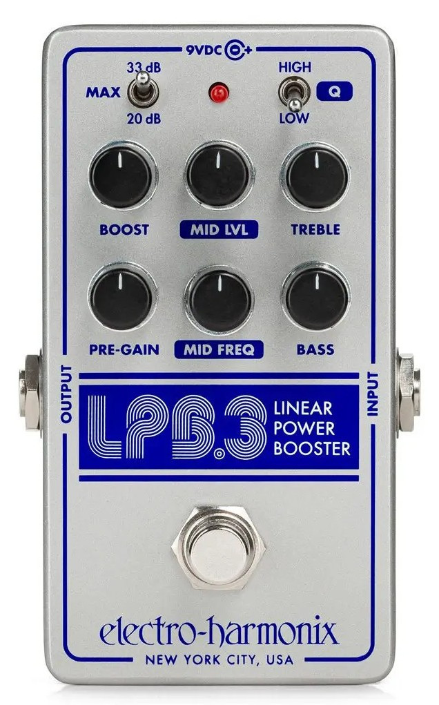 Housed in EHX’s Nano-sized chassis, the LPB-3 is capable of boosting up to +33dB of clean gain with the powerful tone shaping of a 3-band EQ with parametric Mids. The active 3-Band EQ features TREBLE and BASS knobs to control the highs and lows plus a powerful parametric Mids control with adjustable MID FREQ and Q. BOOST sets the overall output of the pedal with the MAX switch toggling between 20dB and 33dB of maximum boost. Use the PRE-GAIN knob to fine-tune the total gain and volume of the boost.