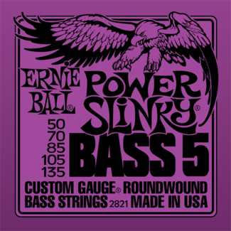 Ernie Ball 2821 Power Slinky 5-string 50-135 Electric Bass Strings - Ernie Ball Power Slinky 5 String Bass Sets are round-wound for maximum clarity and serious punch. Each bass string is manufactured with the finest and freshest raw materials in the beautiful Coachella Valley of Southern California. The list of endorsers for Ernie Ball Slinky bass strings reads like a who's who of top selling artists.