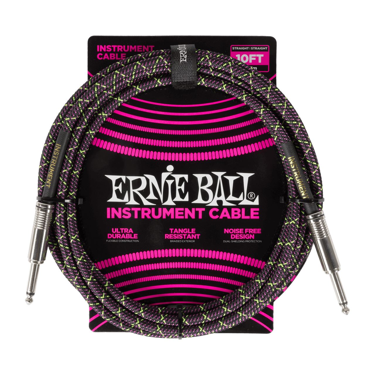 Ernie Ball instrument cables feature a high-quality design made with superior components that are built to last. Dual-conductors deliver reliably clear tone with crisp highs, tight mids, and rich harmonics. Multiple shielding materials preserve the signal with low handling noise, and the braided jacket exterior provides a tangle-resistant experience. Cable length 10ft (3.05m).