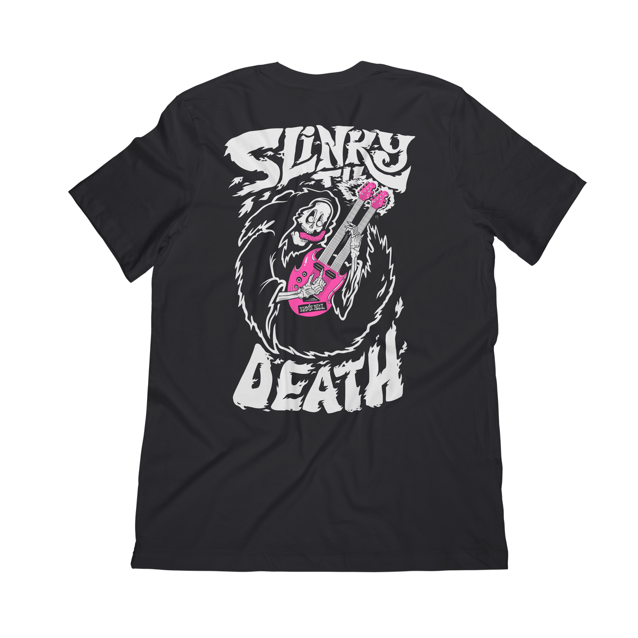 Cheat Death with this ripping Slinky graphic! Featuring our classic Ernie Ball stack logo on the left chest with a full shred fest on the back. Screen printed white/pink ink on black poly cotton jersey t-shirt. 65% polyester, 35% combed ring-spun cotton, 3.5oz fabric.