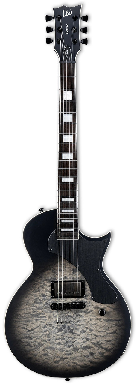 This version of the LTD Deluxe EC-01FT comes in Charcoal Burst Satin Teardrop finish over a flat quilted maple top, and also features white single-ply binding on the body, neck, and headstock. Like other EC-01FT models, it offers set-thru construction at 24.75” scale with a single-cutaway mahogany body and three-piece mahogany neck. The EC-01FT provides a 43mm nut, giving you a touch more fretboard in your hand for big power chords. It features a Macassar ebony fingerboard with pearloid block inlays and 22 extra-jumbo stainless steel frets. A recessed TonePros TOM bridge and string thru body keeps your string height low and comfortable while maximizing resonance. Other features include LTD locking tuners and a brushed black pickguard. Perhaps the biggest advantage of the EC-01FT is the Custom 14, designed exclusively for ESP by Seymour Duncan. Purpose-built to cover the specific needs of the ESP player, the EC-01FT’s flexible and dynamic Custom 14 pickup offers everything you need, ranging from clean, chimey intros to sizzling rock, classic metal, and hardcore tones… and the most crushing modern chug you ever hoped for. A push-pull control on the volume knob splits this pickup to the most wide-ranging single coil bridge territory we've ever offered.