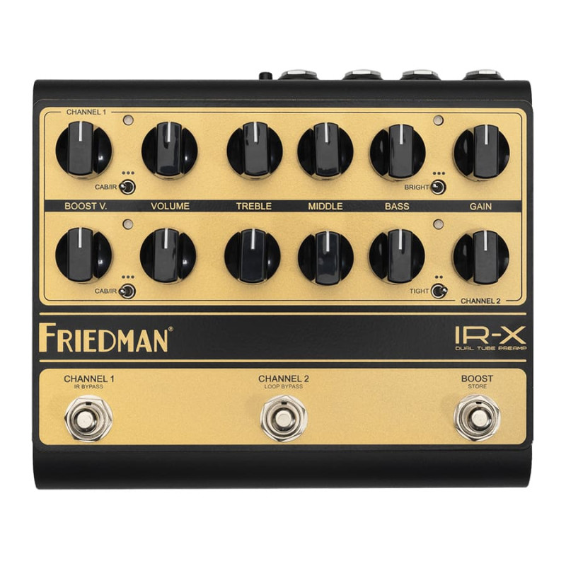 The Friedman IR-X dual-channel tube preamp is an entire Friedman rig in a compact pedalboard-friendly package. Powered by two high-voltage 12AX7 preamp tubes, each channel delivers the harmonic richness and touch response of Dave Friedman’s finest designs. DSP IR cabinet/power amp simulation sends a studio-quality mic’d-up tone to your DAW or Front-of-House. The IRX provides easy-to-use controls without complex menus and 100-page manuals.
