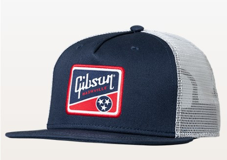 This classically styled blue and white Trucker hat features the Gibson logo, the Tri-Star emblem from the Tennessee state flag, and a shout-out to our home city of Nashville.