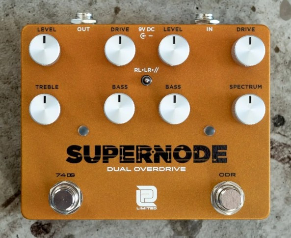 The Supernode is an all-analog, dual overdrive pedal designed with versatility in mind. The layout is divided left and right into two sections. The right side is our version of the iconic ODR. All the tone and feel with the addition of a post-clipping Bass control and an internal trimmer to adjust the amount of pre-clipping low frequencies labeled Saturation. The left side is a modified version of the Seventy4 Deluxe Green channel. All of the 70’s Super Lead punch and growl with a simplified layout. Should you find yourself missing the Mids control, there is a trimmer inside that is just that.