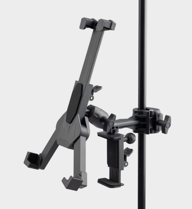 TCM1500 Tablet/Smartphone Holder mounts to a mic stand or desktop and securely holds a tablets while simultaneously holding a smartphone or battery. Both holders adjust to fit tablets and phones of various sizes. Padding on the holders prevents slipping and protects your device from scratches. The versatile mount can screw directly onto the threaded end of a mic stand or boom, or it can use the included clamp to attach to shafts or desktops. A wide range of tilt and rotation facilitates positioning for ergonomic tablet viewing and operation.