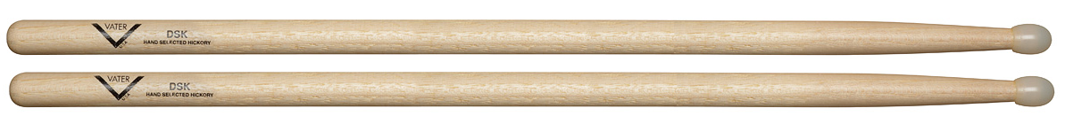 A lengthy, but comfortable, stick that features a very fast beefy taper for some added weight up top. This allows for a powerful "throw" and solid impact that is perfect for an aggressive drumming style. The DSK's large and rounded barrel-shaped nylon tip is great for crispy clean hi-hat and ride cymbal tones. Hickory